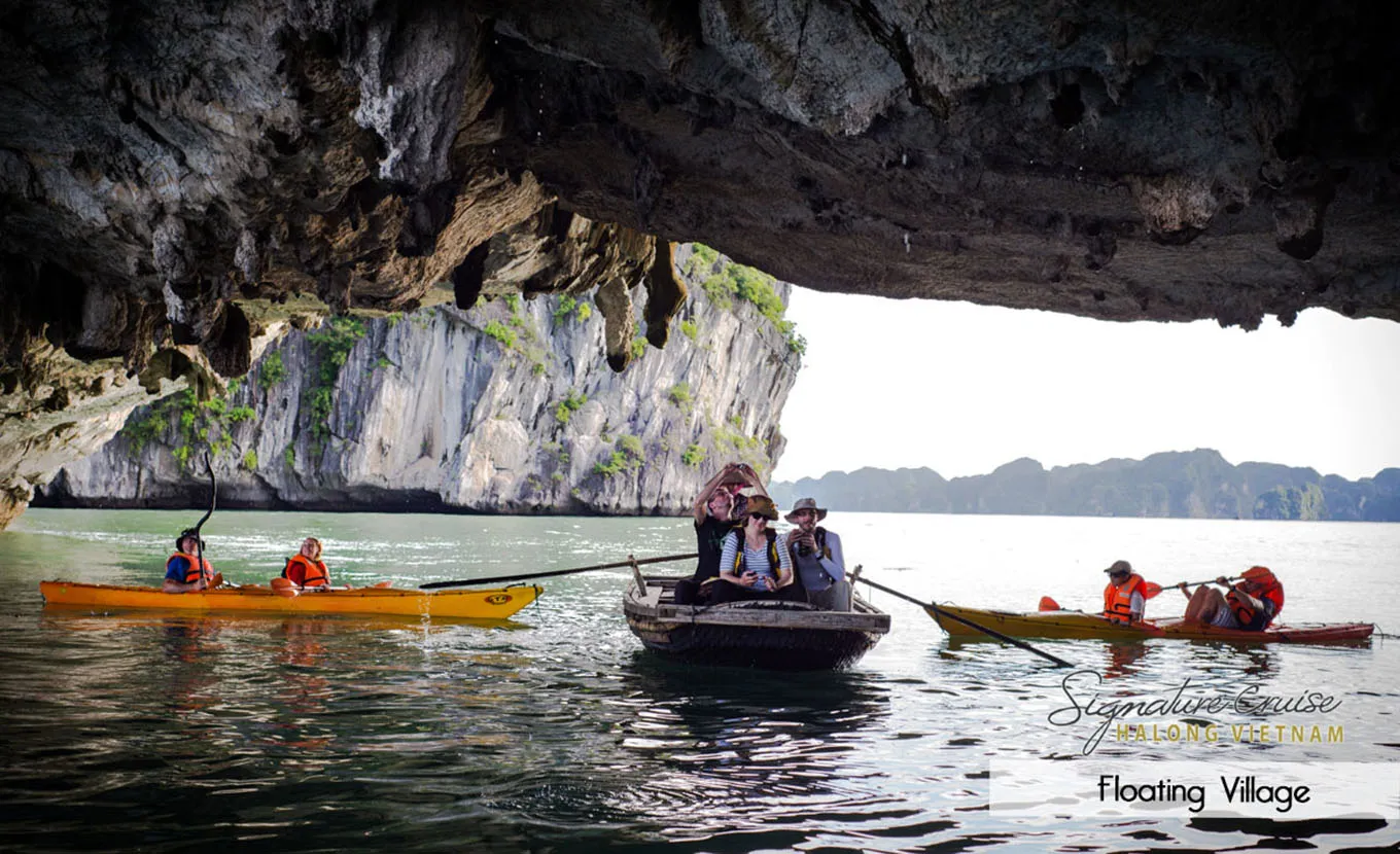 15:00: After lunch we set sail for Bai Tu Long Bay passing the towns of Hon Gai and Cam Pha, extraordinary limestone karst landscapes. Explore Vung Vieng fishing village by local rowing boats to discover the interesting daily lives of its inhabitants.