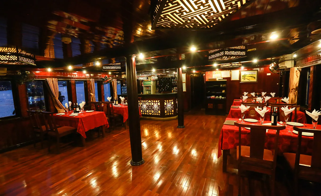 19h00: Sumptuous set dinner on board.20.30 - 22.00: Free time to challenge yourself in Vietnamese puzzle games or gather your group/family for a board game; try your luck with squid fishing or simply have a cocktail and enjoy the quiet night on the bay.