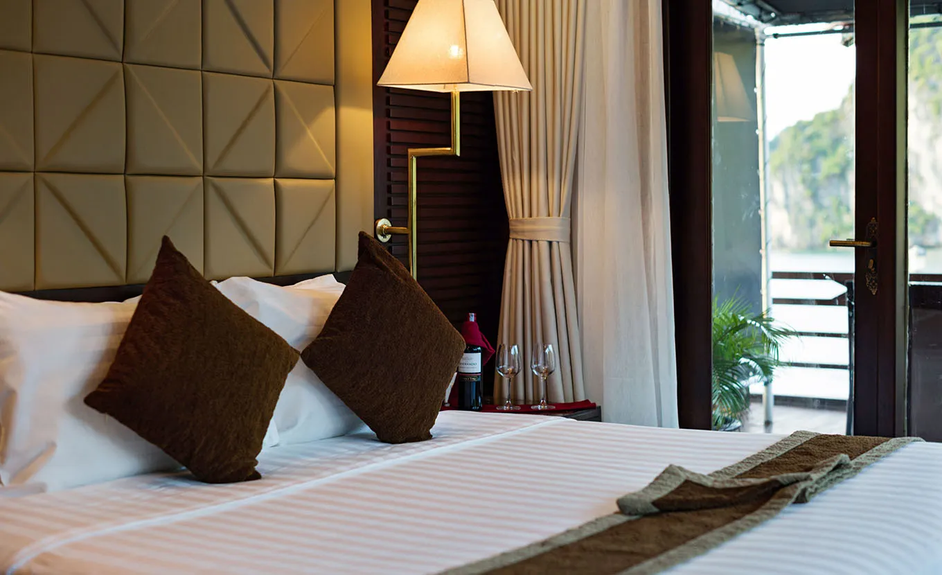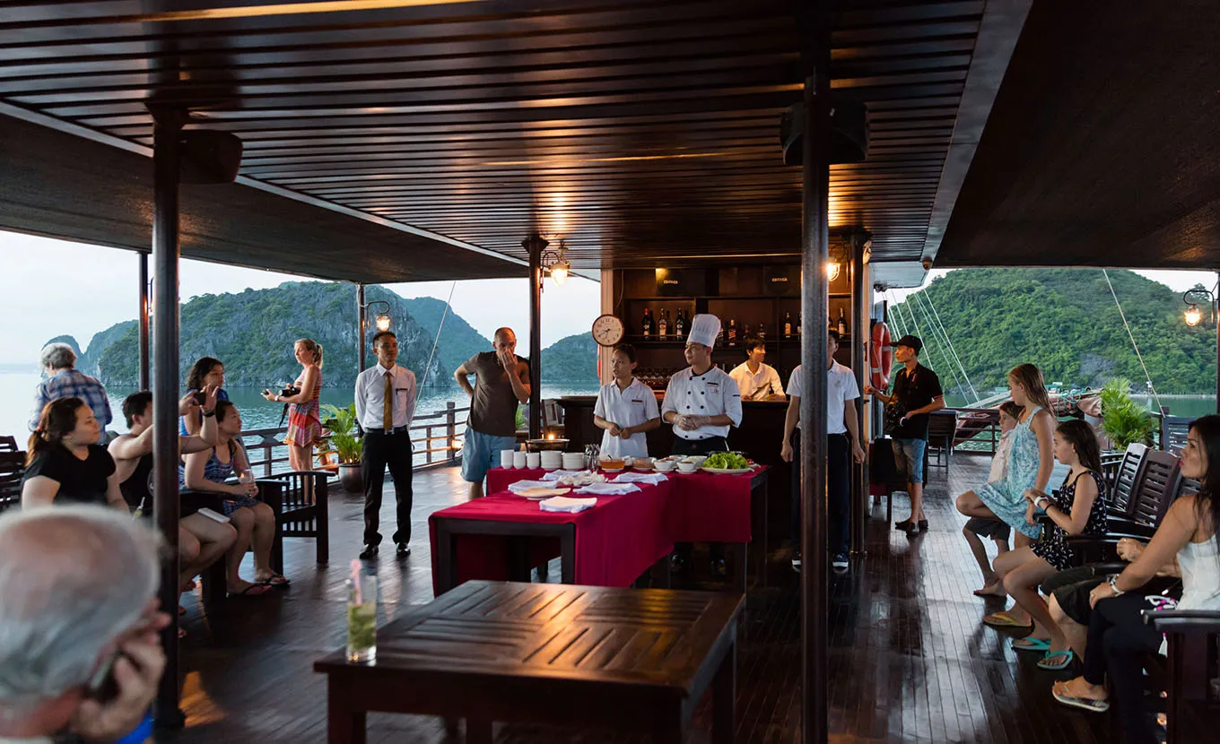 18:30: Attend the Cooking class on sundeck – How to make Vietnamese spring rolls - traditional Vietnamese food. Then enjoy Happy Hour (Buy one drink-get one free). It is time for chit chat and relaxing. Watch the magnificent sunset over Halong Bay.