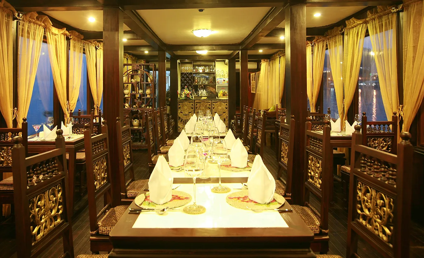 19:30: Deluxe Vietnamese Dinner will be served. Evening activities include: Leisure time for chatting around the bar, watching many sorts of Vietnam cultural films.  Relaxing and spending a romantic night on cruise’s music. Reading magazines in room and dining room. You may also try your luck with squid fishing on the boat.