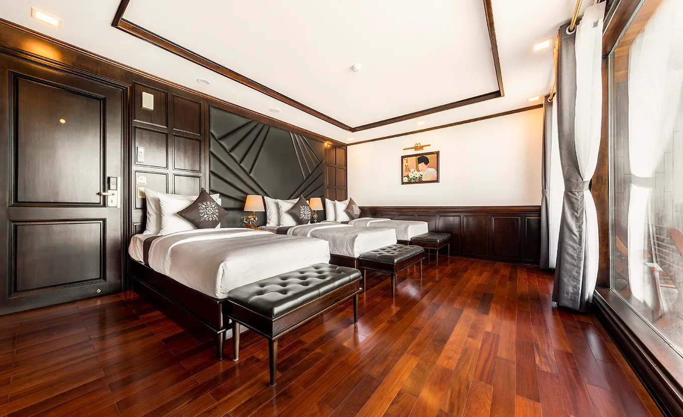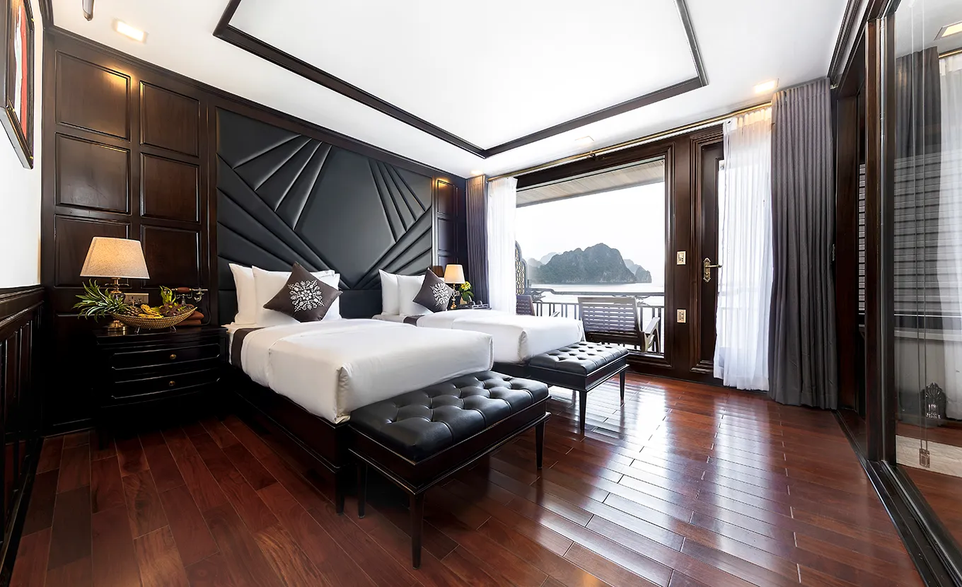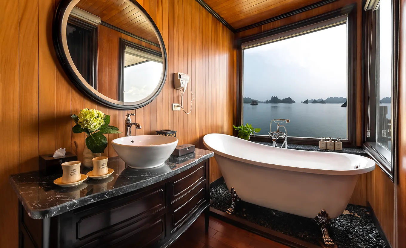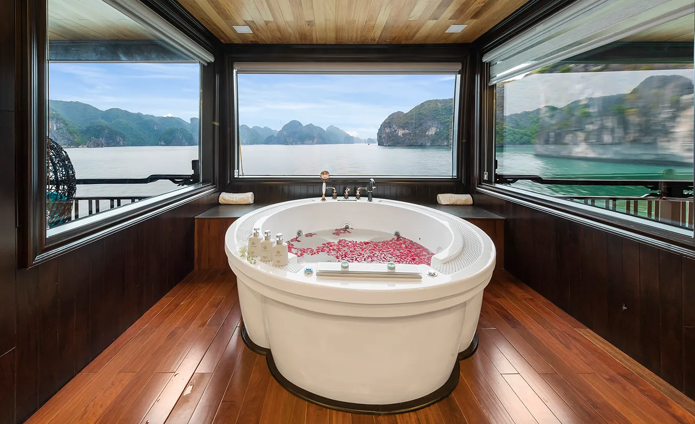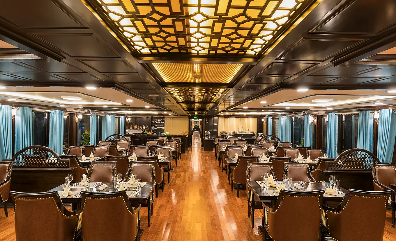 13:15 A delicious set lunch is served in Ha Long Restaurant while the cruise sails past Chan Voi (Elephant Feet) and Tra Bau Area.