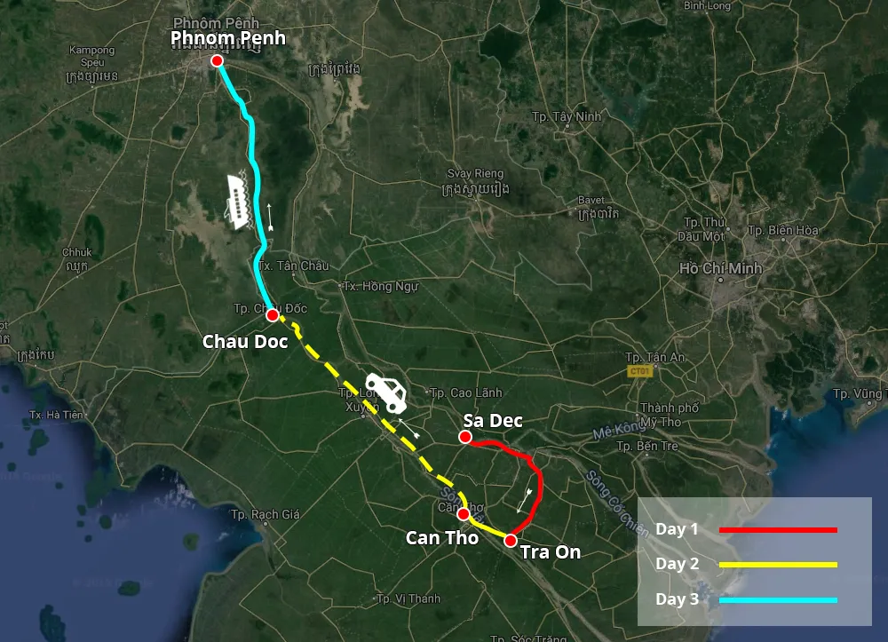 Explore Mekong Delta in private 01 cabin Gecko Eyes boat. The 3 days tour offers you truly unique experience, witness the tranquil countryside and interact with local people in Mekong Delta before enjoy 5 hours speed boat to Phnom Penh – capital of Cambodia.