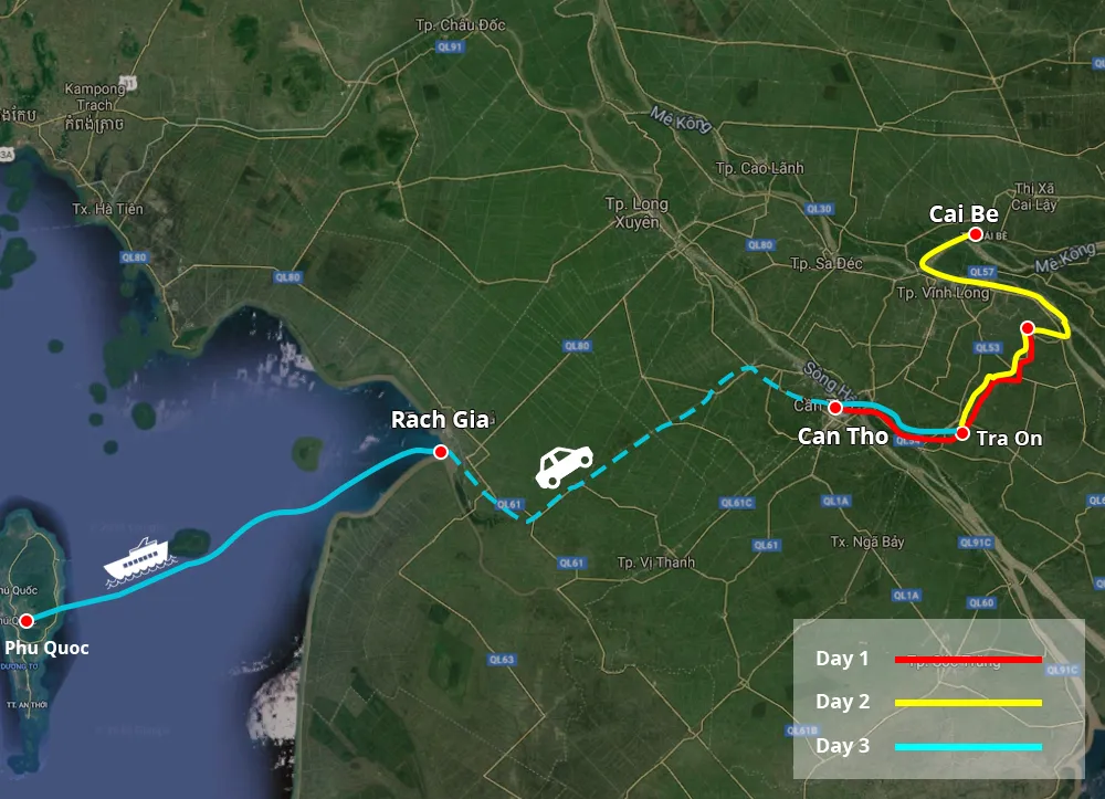 09:00: Road transfer to Rach Gia, lunch box (shuttle bus service)