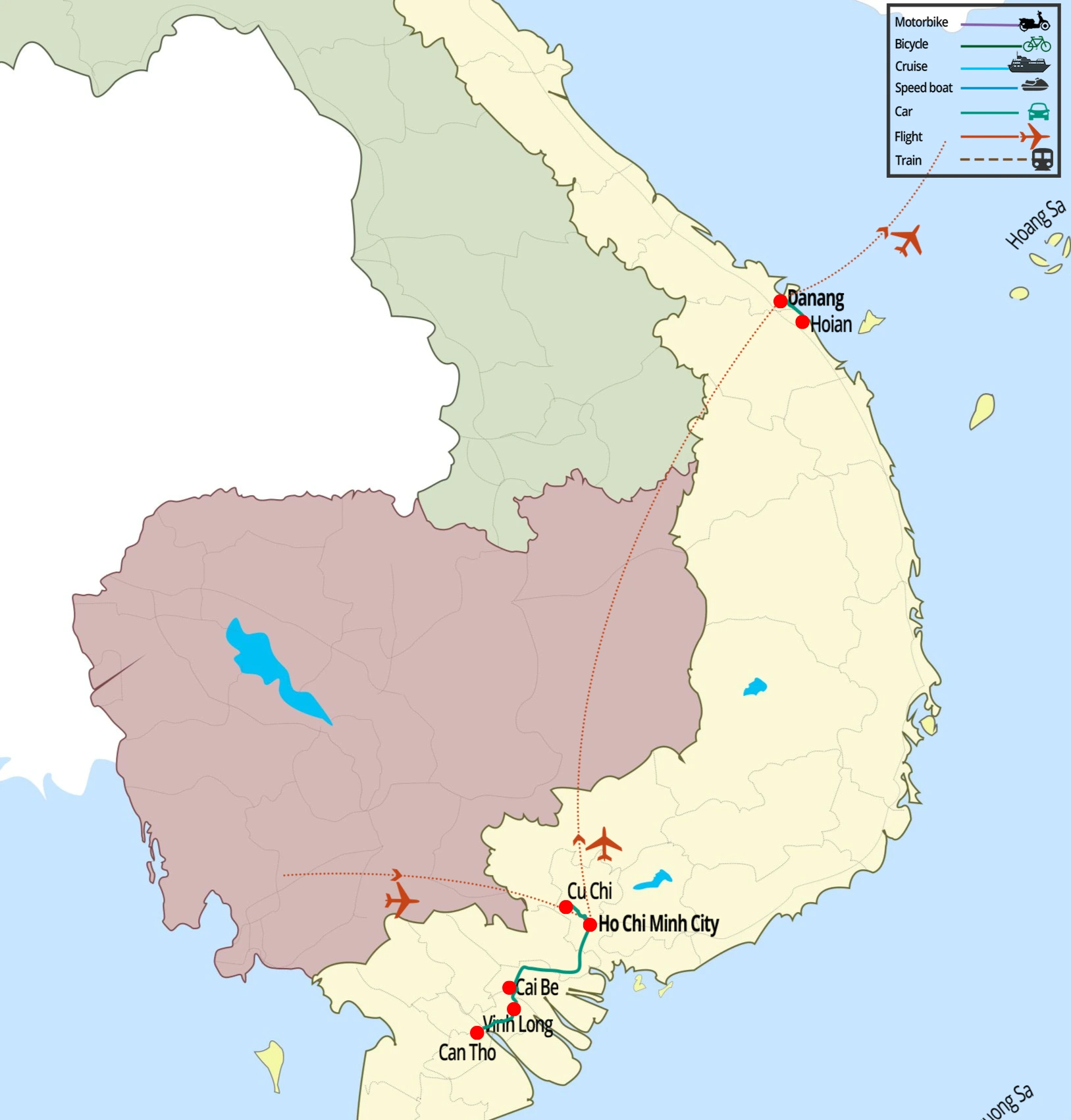 Explore the vibrant essence of Southern and Central Vietnam with our meticulously crafted 10-day tour package. Immerse yourself in the bustling streets of Saigon, traverse the serene waters of the Mekong Delta River, and experience the timeless charm of Danang and Hoi An. Discover the cultural richness, historical significance, and natural beauty of these iconic destinations, all seamlessly woven together for an unforgettable journey through the heart of Vietnam.